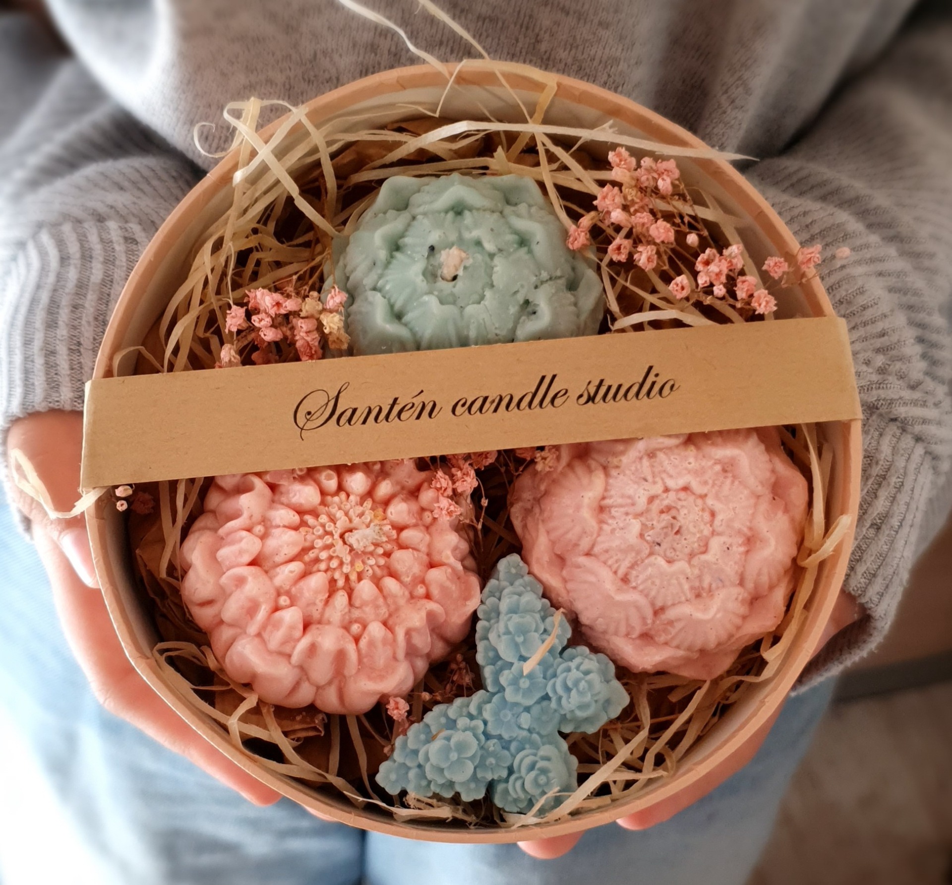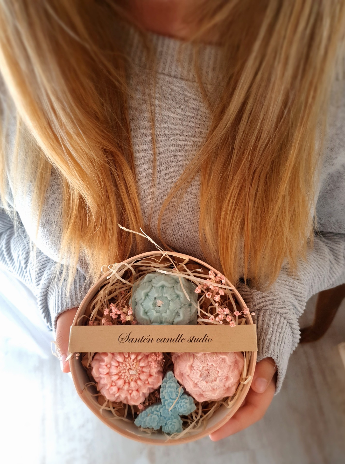 • Obsah balení: 3x ručně vyráběné květinové svíčky.