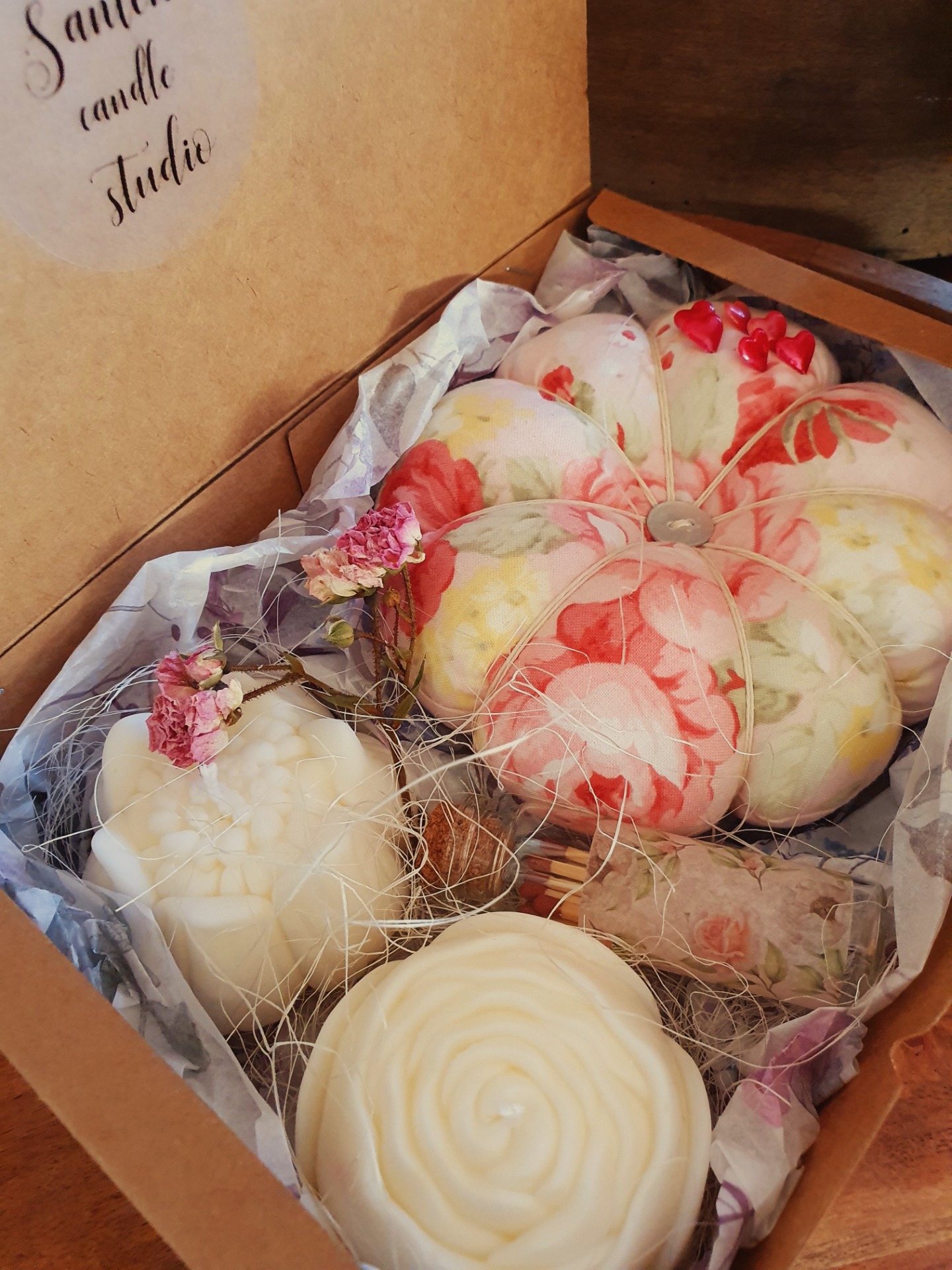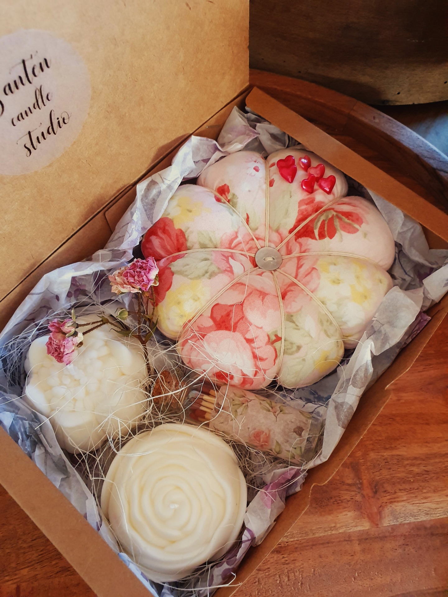 Romantický dárkový set pro šikovné ruce i duši – jehelníček + 2 sójové svíčky + zápalky ve skleničce