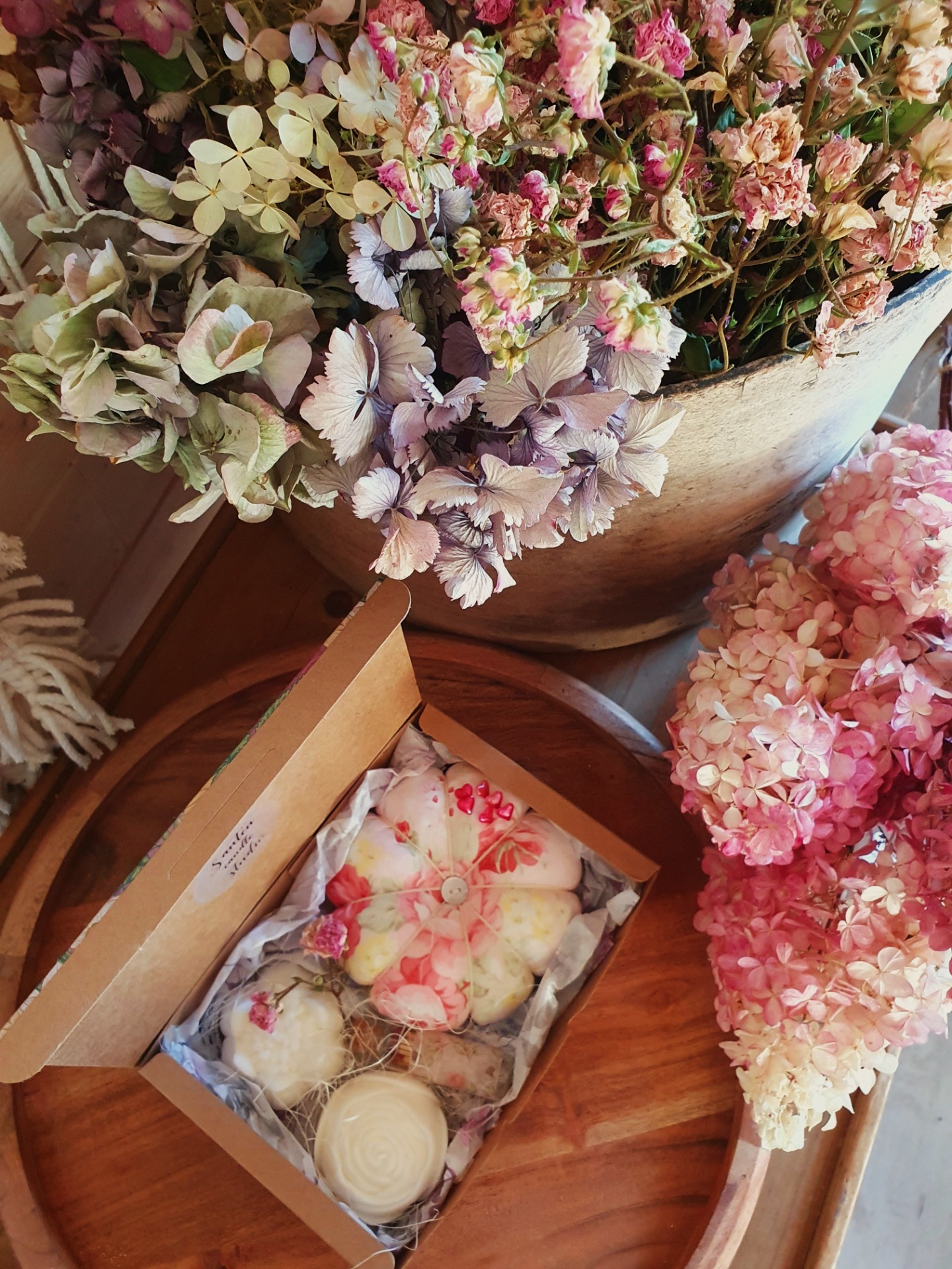 - 2 ručně odlévané sójové svíčky – čistě přírodní, jemné a dekorativní (tvar růže a květu).