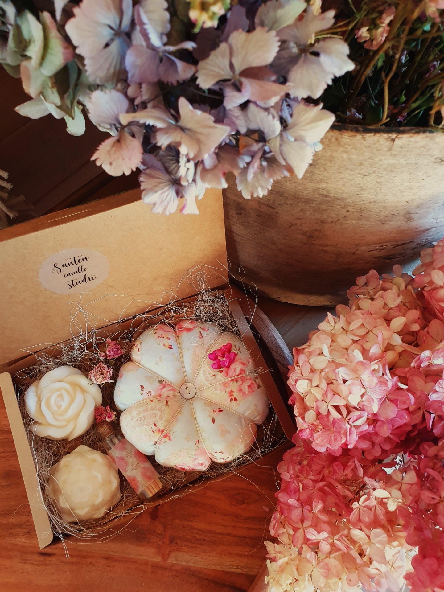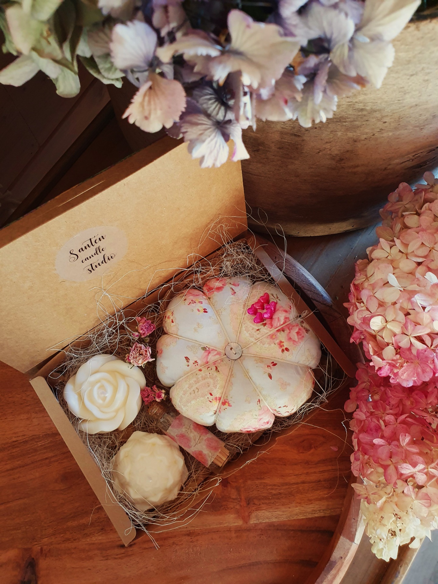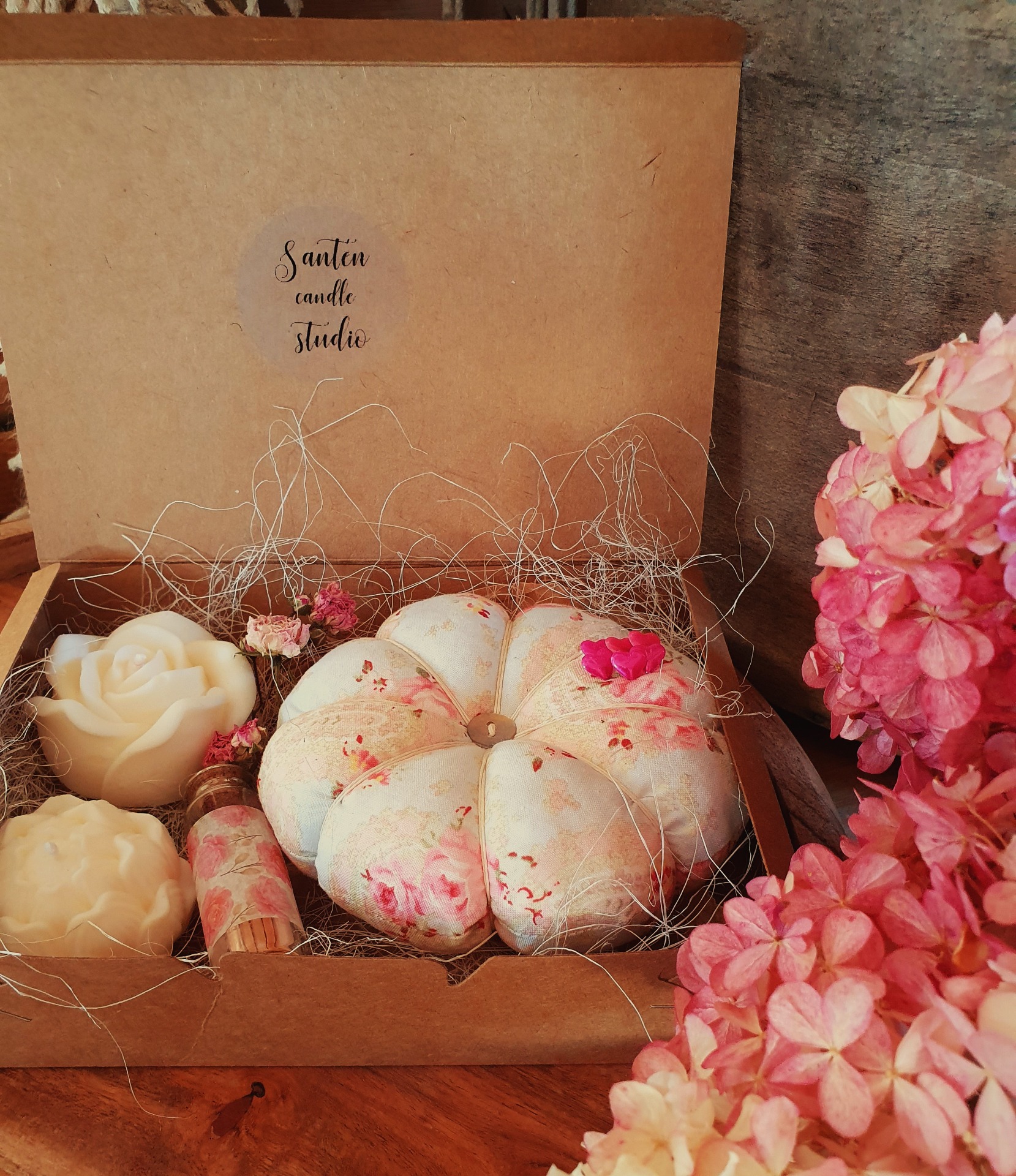 - 2 ručně odlévané sójové svíčky – čistě přírodní, jemné a dekorativní (tvar růže a květu).