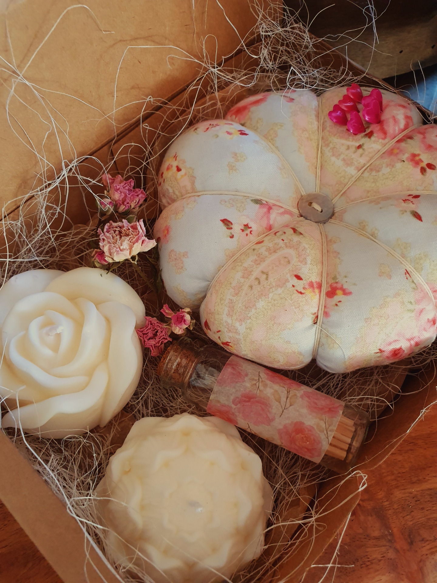 Romantický dárkový set pro šikovné ruce i duši – jehelníček + 2 sójové svíčky + zápalky ve skleničce