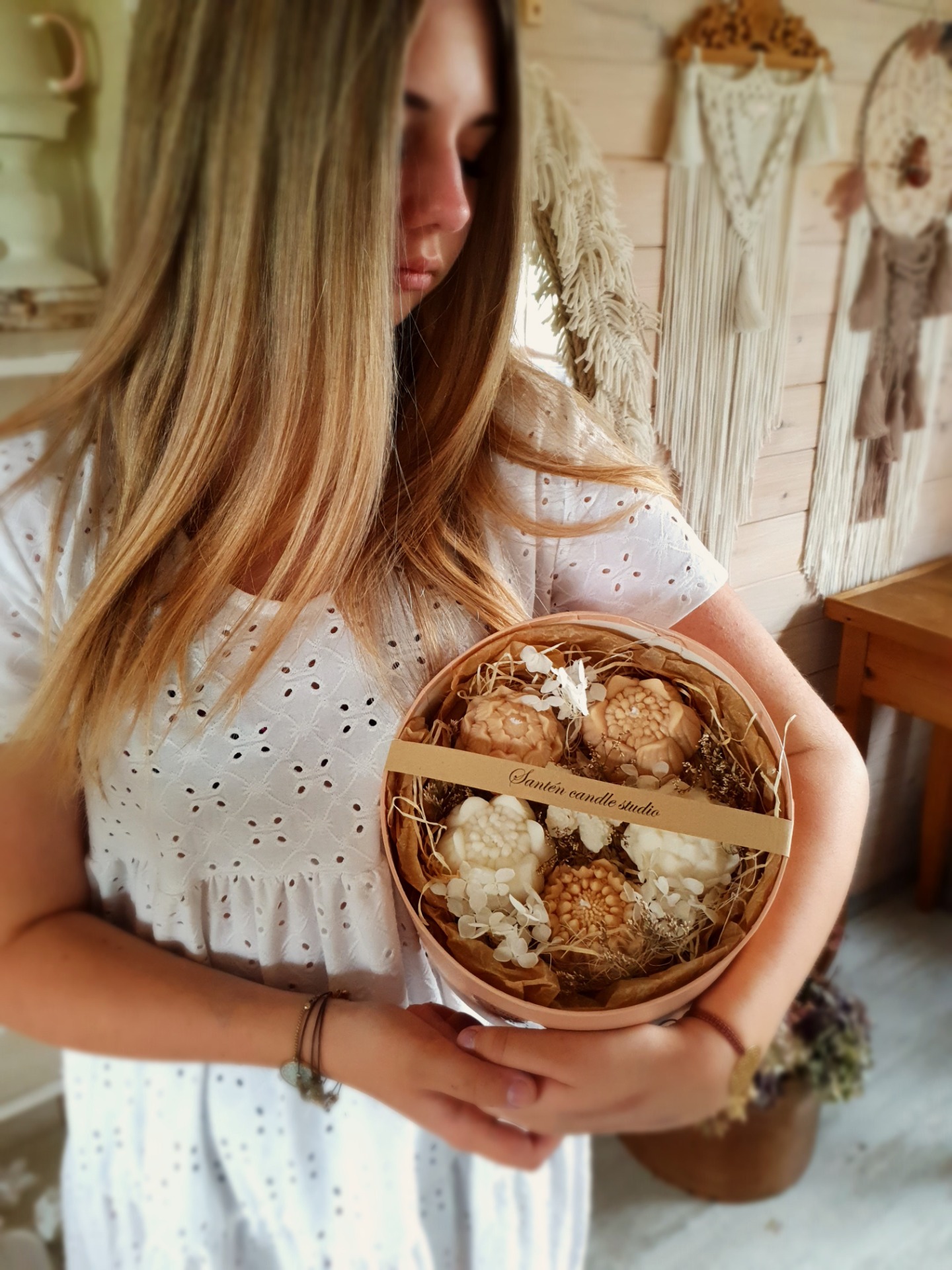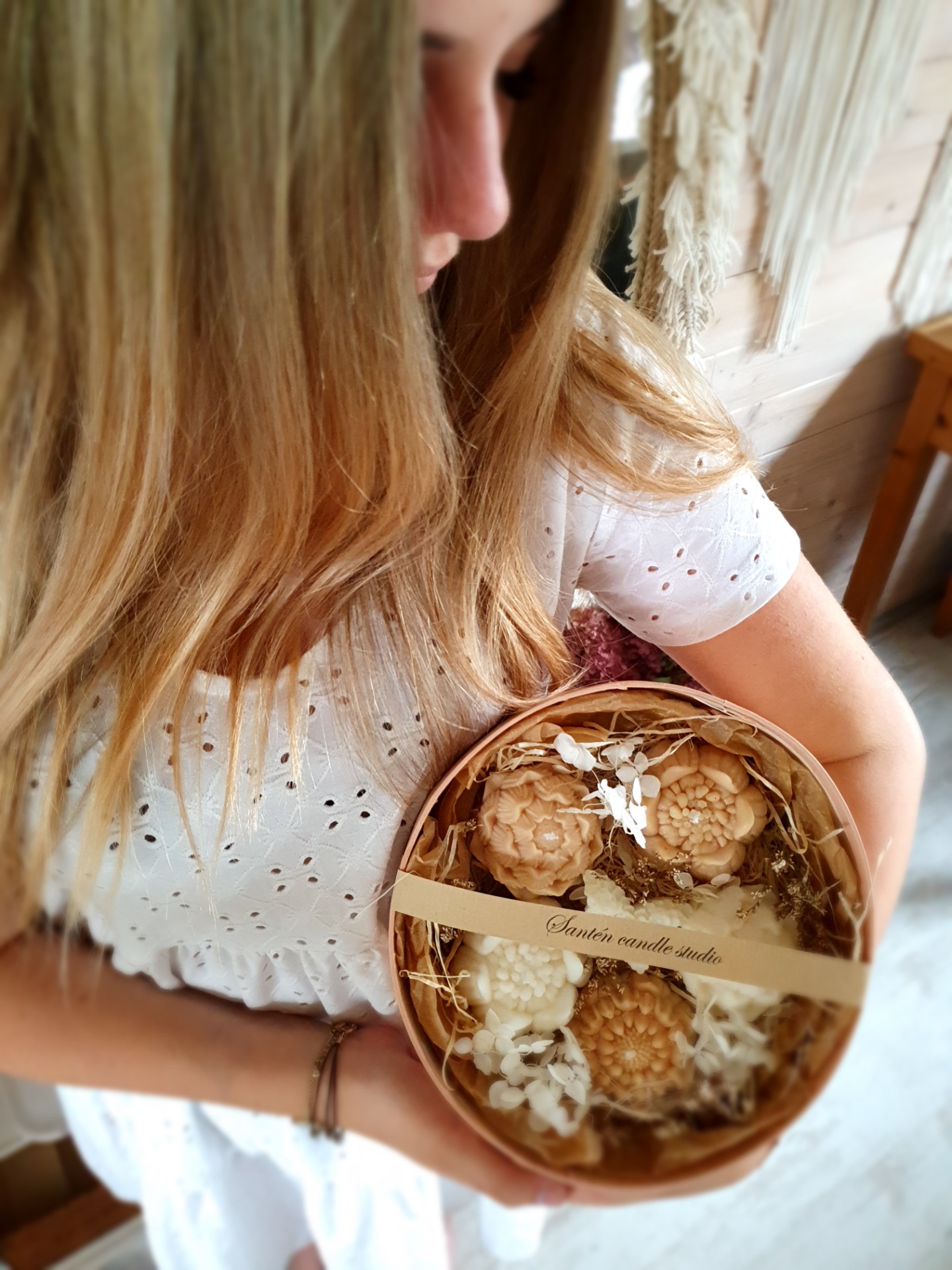 Každý kus je pečlivě odlitý z kvalitního sójového vosku a aranžovaný do dárkové krabičky s přírodní výplní.