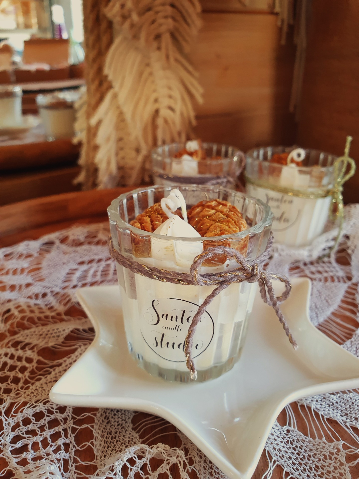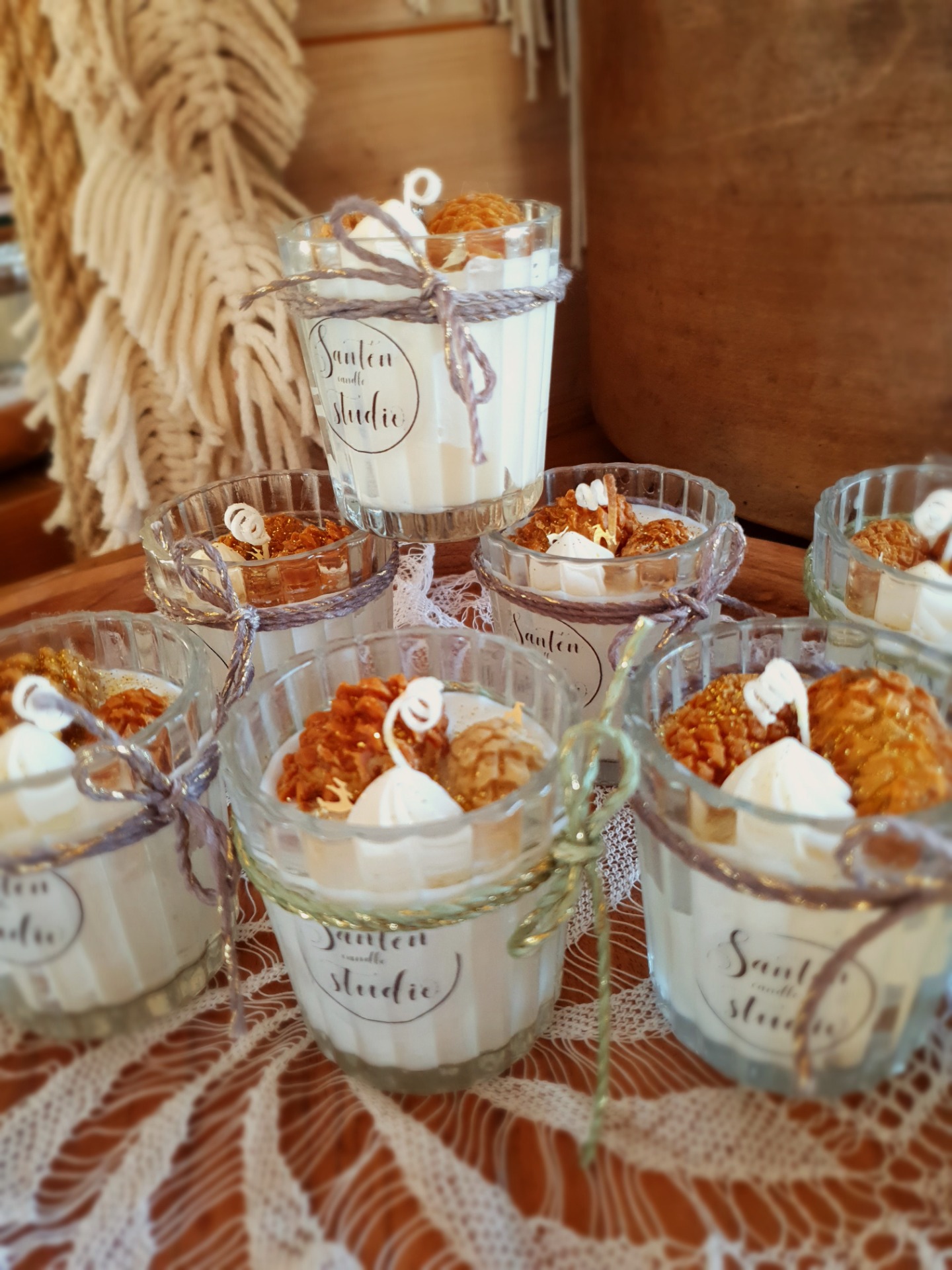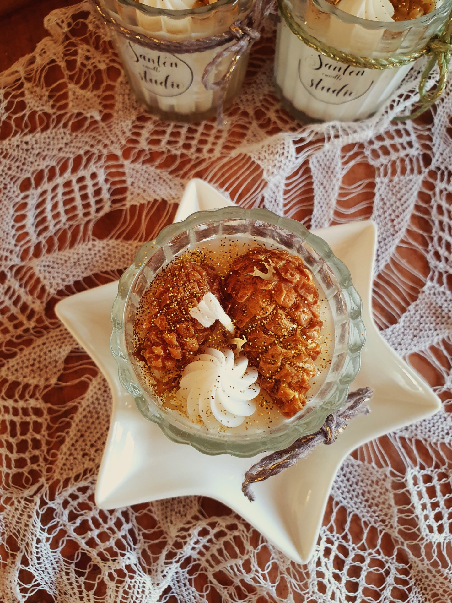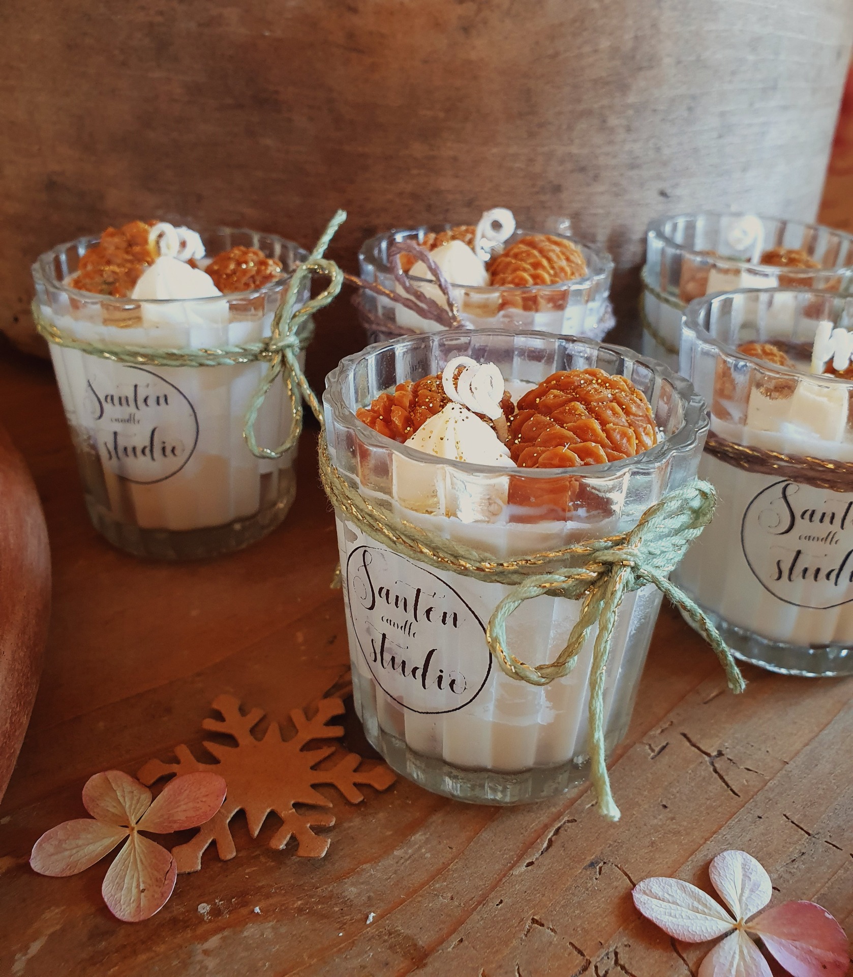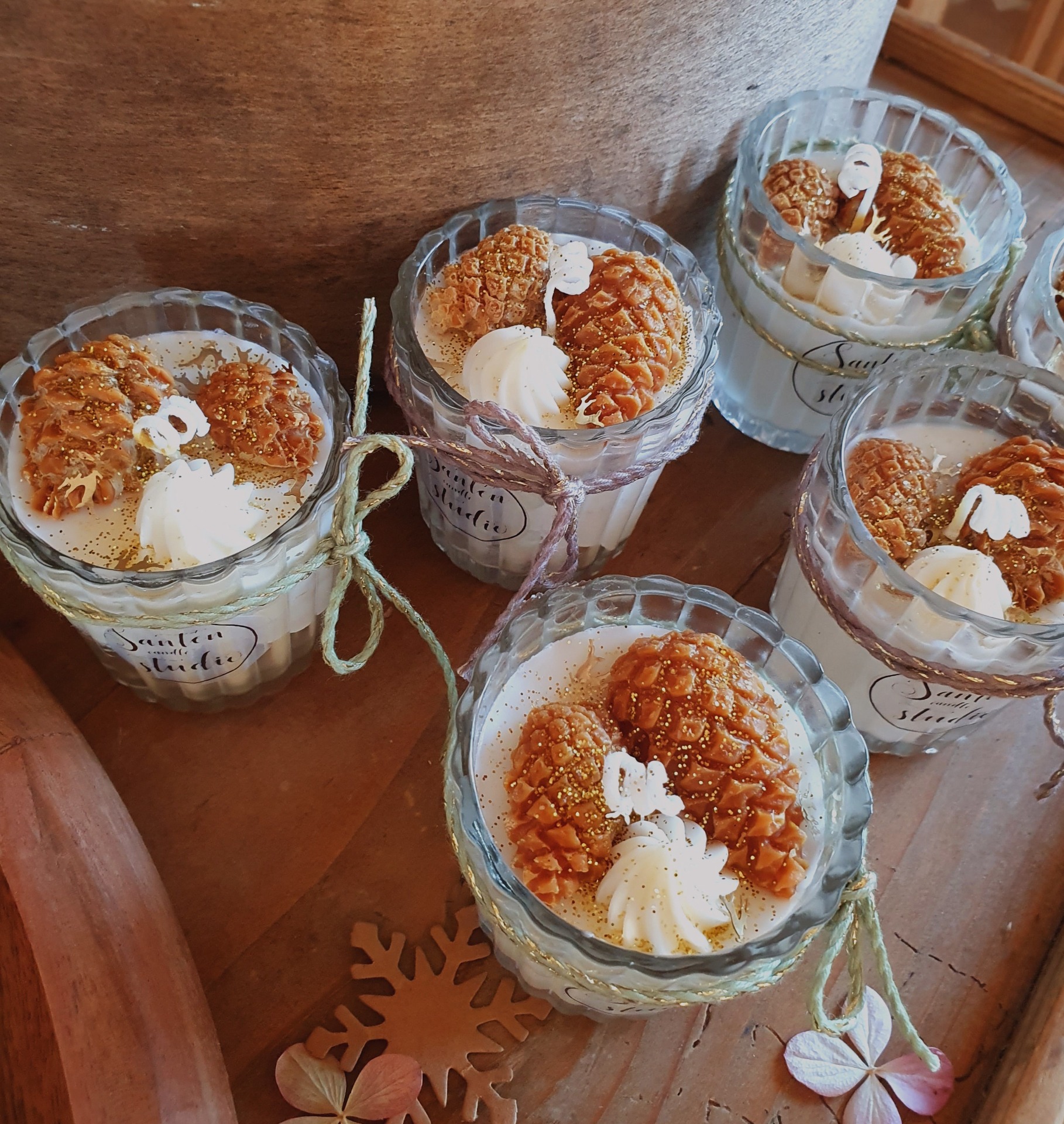 Malá roztomilá svíčka ze sójového vosku bez vůně s Vánoční dekorací malých šišek.