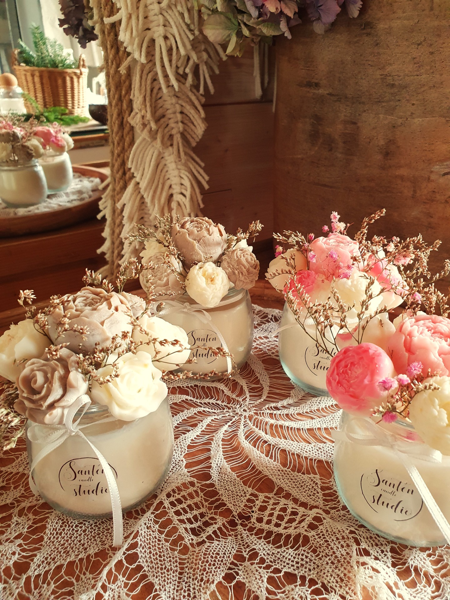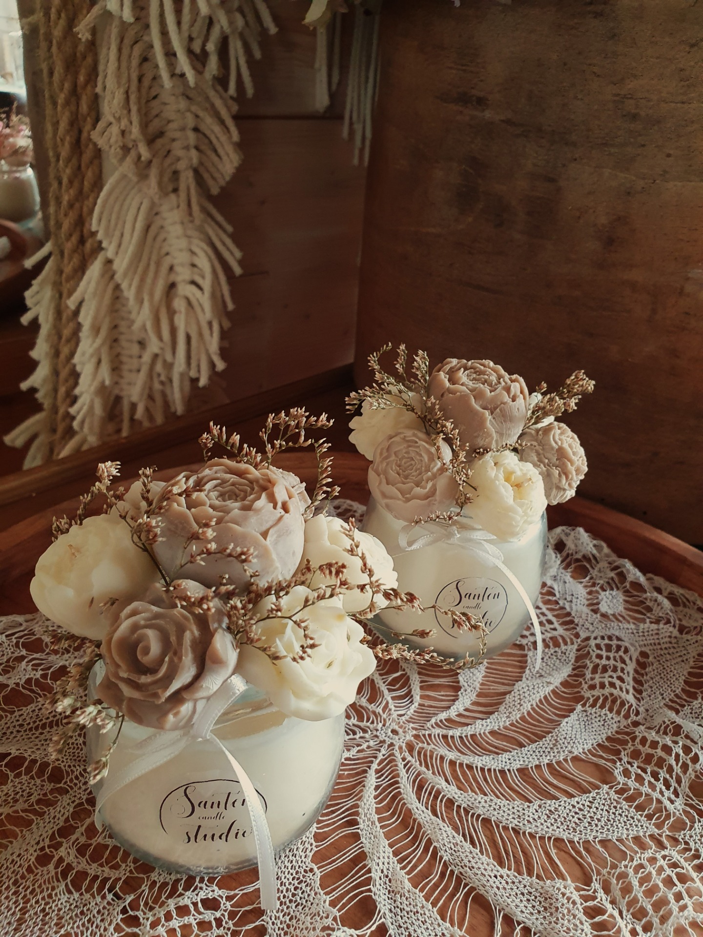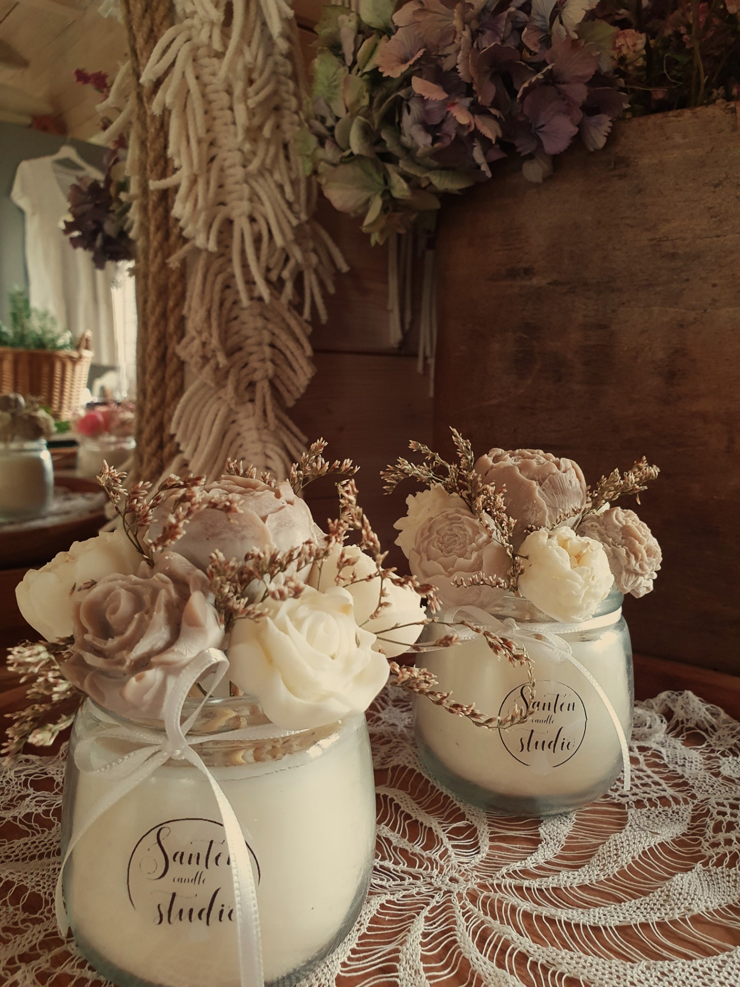 Kytičky jsou zapíchány do vosku a tvoří krásnou romantickou dekoraci.